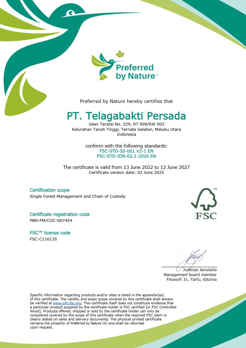 ®). Pada pertengahan Juni 2016 PT. Telagabakti Persada telah meraih sertifikat FM/CoC-FSC dari Rainforest Alliance. Sampai dengan saat ini PT. Telagabakti Persada tetap berkomitmen mempertahankan sertifikat FM/CoC yang telah diperolehnya dengan mempertahankan dan meningkatkan kinerja pengelolaan hutannya. Komitmen ini dibuktikan dengan diraihnya kembali sertifikat FM/CoC-FSC saat  resertifikasi FM/CoC-FSC pada tahun 2022 dari Lembaga sertifikasi Preferred by Nature.