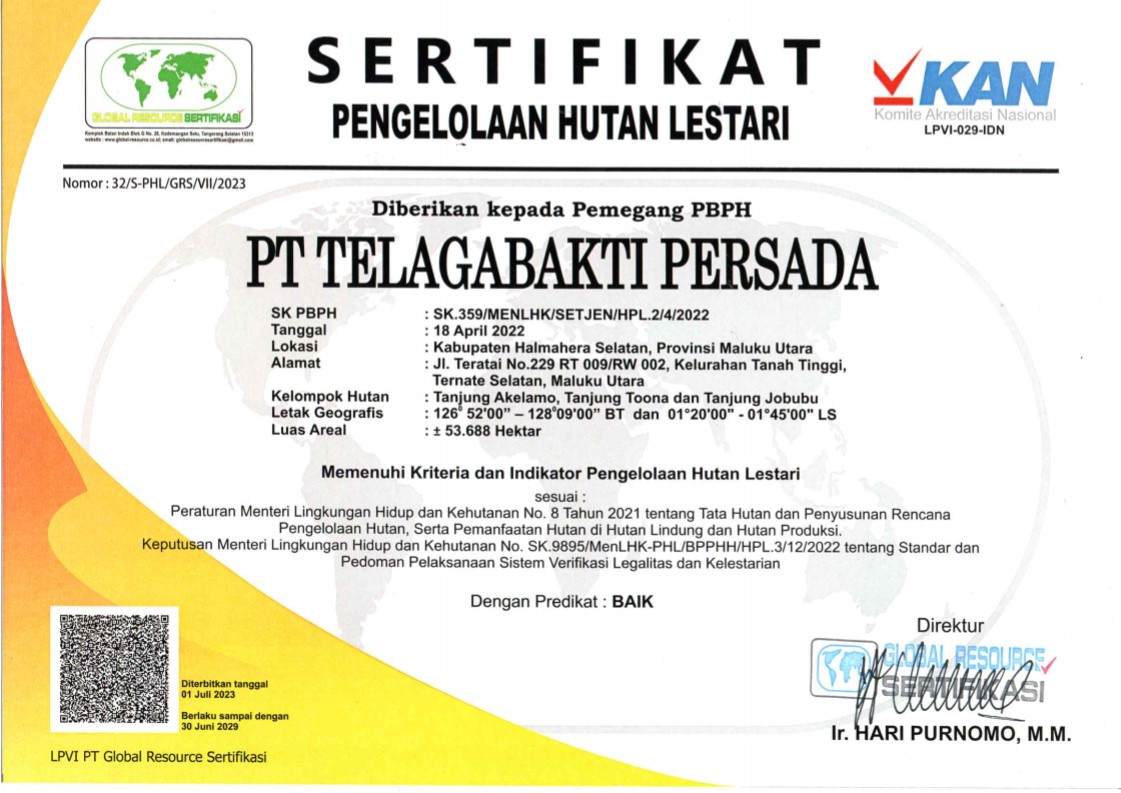 PT. Telagabakti Persada berkomitmen untuk melaksanakan kegiatan Pengelolaan Hutan Lestari demi tercapainya kesinambungan hasil hutan & lingkungan, oleh karena itu PT. Telagabakti Persada memiliki inisiatif untuk melakukan sertifikasi terhadap kinerja pengelolaan hutan yang sesuai dengan standar yang berlaku dan diakui secara nasional maupun internasional.